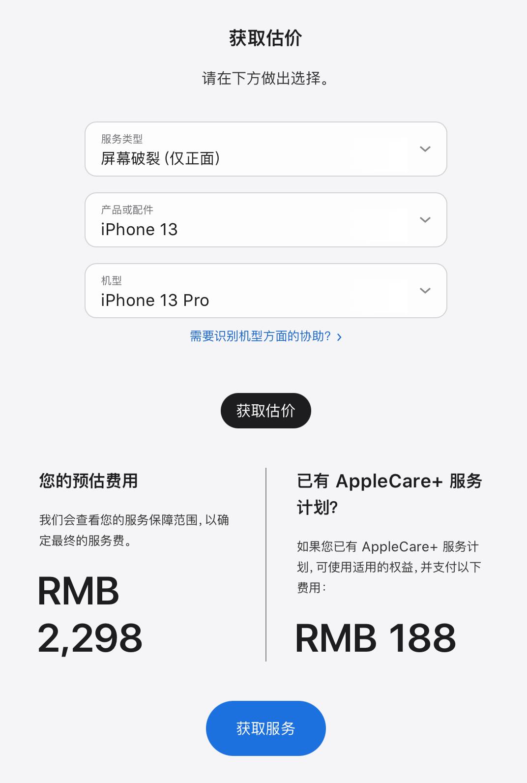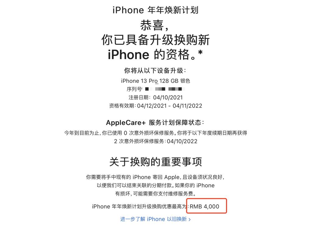 不过这个折扣并没有想象中划算,就以我自己的iPhone13 Pro(原价7999元)为例,由于我去年使用过一次Apple Care+,所以苹果官方只给了我4000元的折扣,如果没有使用过,这个价格应该是4800元。
