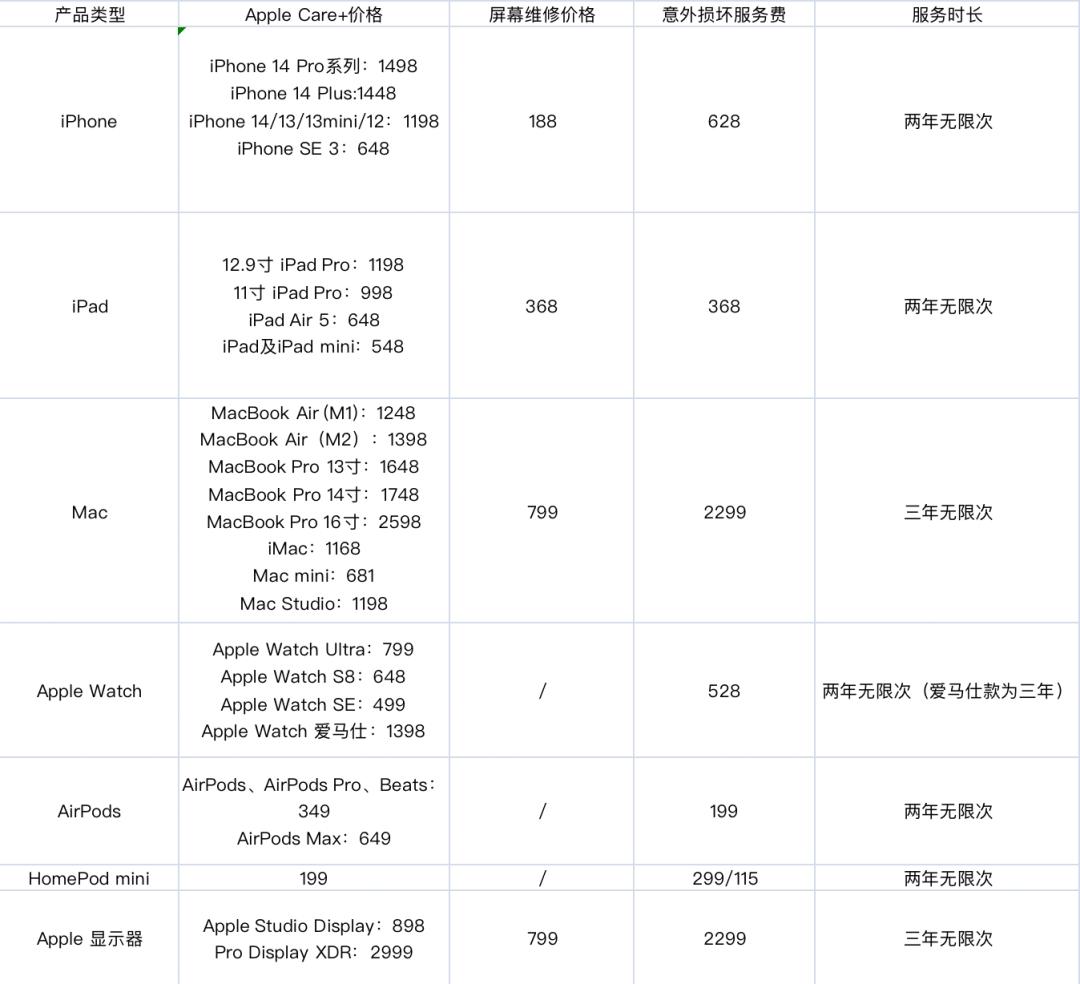 价格方面,苹果几乎对所有的产品都进行了细分,简单来说就是较为便宜的苹果产品的Apple Care+价格下调,较高的则保持不变。 同样以iPhone为例,如今只有iPhone 14 Pro和iPhone 14 Pro Max保持在1498元,其余几款官网在售机型都进行了相应下调,最低为648元。