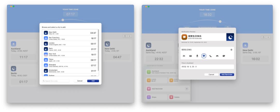 有了直观的时区对照功能,我们也可以通过为此创建通知提醒,比如我想给远在新西兰的亲戚送上祝福,可以定位到需要送上祝福的时间,然后双击卡片选择「Add Reminder」来添加对应的提醒事项。