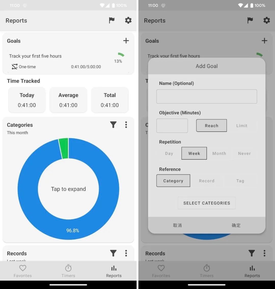 与大多数时间管理应用一样,Pivot 允许我们实时设置计时器或是在完成某项事务后,手动添加记录。在应用主界面,我们可以通过点击播放按钮来开始一段计时,并在完成后通过点击停止按钮来完成此次计时。