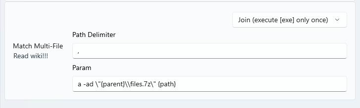 另一个重磅的功能更新就是「Match Multi-File」功能,它具有「EACH」和「JOIN」两种执行模式,它们分别使用「逐个传递参数」和「根据配置逐个添加」的方式分别在多个选中文件中执行 EXE 参数。该功能使用起来相对复杂一些,需要提前阅读 使用说明 。