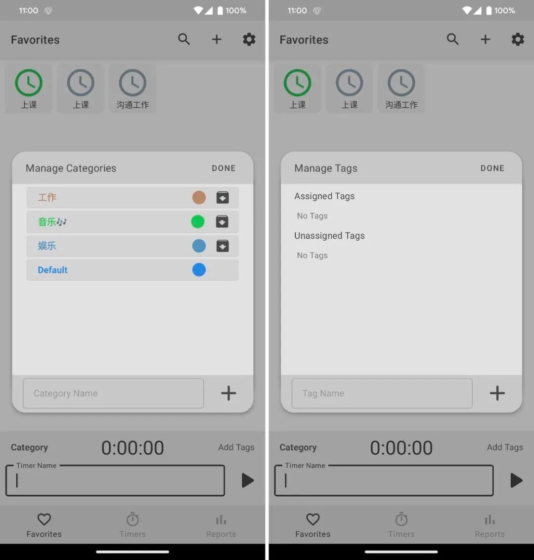 当然仅仅计时还远远不够,如果想要后续对自己的时间安排有更为清晰的认知,就需要用到分类和标签功能,Pivot 允许我们添加不同的分类及标签,我们可以简单地将自己的时间划分为工作、娱乐、睡觉等,也可以结合自己的生活实际进一步细化分类。在分类之余,我们还可以利用标签来标注自己的情绪状态、精力状态等,总之,用法全凭自己的使用习惯。