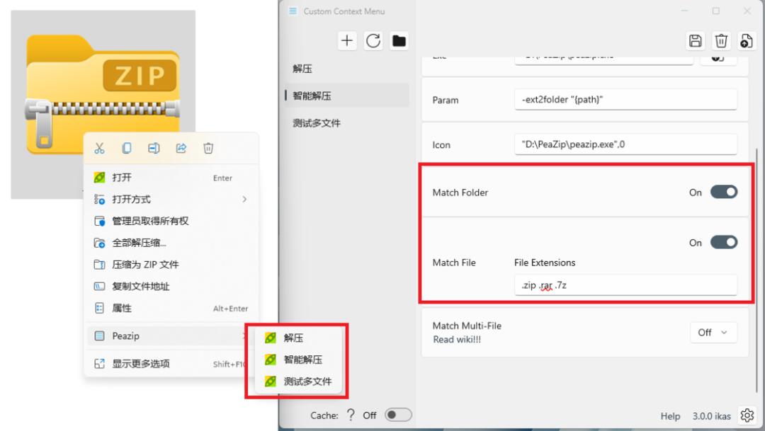 Custom Context Menu 支持文件类型匹配,例如只匹配 *.zip、*.7Z 等压缩文件来调用解压缩功能。更新之后,Custom Context Menu 为该功能提供了开关,如果不需要它,直接关闭就好,此时添加的菜单项就会在所有文件类型下展示。与文件对应的是,我们还可以通过新增的「Match Folder」功能开关选择是否匹配文件夹。