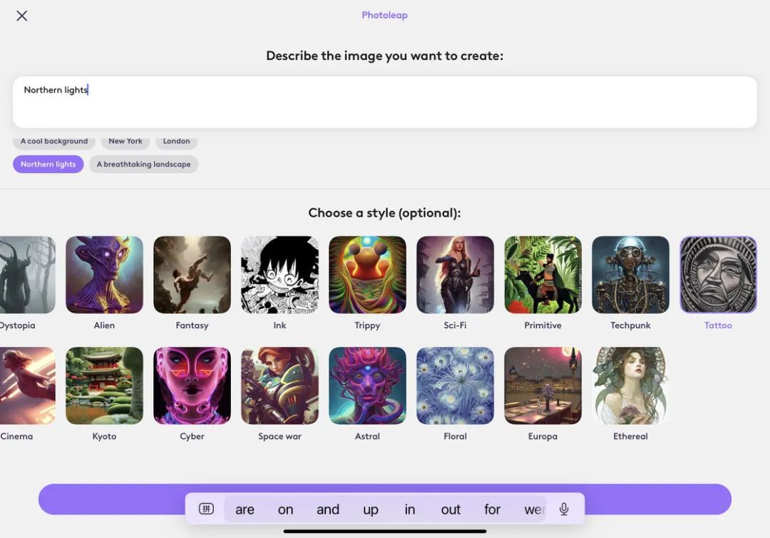 实际上,Photoleap 中所谓的「文字转图像」,就是今年在社交媒体上开始大肆流行的 AI 图像生成技术:通过输入足够的关键字信息,比如「毕加索风格的外星芭蕾舞演员潜水」或是「写实风格的海鸥思考生命的意义」等内容;并从各种风格中选择你想要让作品所呈现出的风格,然后 Photoleap 就能自动生成对应的一张照片,如果你觉得不满意,只需再点击一次即可重新计算生成。