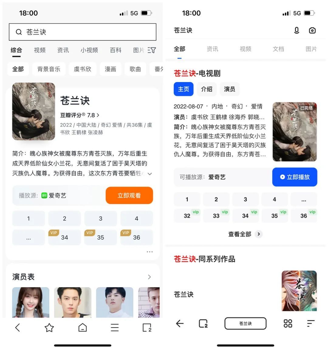 和夸克、简单搜索依赖百度引擎不同,应用会直接调用悟空搜索引擎,它的搜索结果与头条搜索有 90% 以上的相似度,不过在视频、资讯、大家都在搜等模块展现的顺序上会有所不同,当然最重要的一个卖点就是「无广告」。有头条内容的加持,在一些热搜词条上悟空并不会与百度拉开较大差距,甚至在时效性和内容质量上还会有一些优势。悟空搜索还会提供一些关联度极高的搜索词,例如在搜索「苍兰诀」时我可以快速了解相关歌曲、番外、火爆程度等信息,非常实用。而在搜索一些小众内容时,你还是可以明显地感觉到头条的聚合渠道并不如百度丰富。另外,由于悟空有自己的多媒体聚合和快懂百科,在使用习惯上会与百度有一定差异。