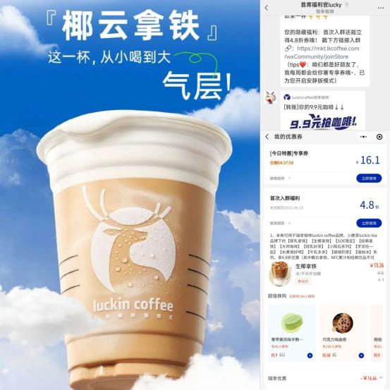 不得不说,互联网流量玩法,瑞幸算是彻彻底底玩明白了。一开始是补贴的低价玩法,然后是用全网爆火的6块8一杯的生椰拿铁引流做私域的运营,然后用10块钱门槛的月度会员来提高复购率。除此之外还隔三差五在微信群里面做不同咖啡品类的特价活动保持活跃度,以及还有邀请好友免费喝咖啡的裂变活动,最近这一年还每隔几个月就推出新品咖啡,最近这几个月还跟“椰树牌”搞联名咖啡。这就是一套标准的互联网流量玩法,而上一个玩流量玩出名的品牌就是买美妆品的完美日记。