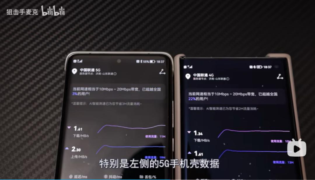 另外,根据 B 站 UP 主 @狙击手麦克 的实测,尽管在手机壳的加持下点亮了 5G 信号,但网速更像是 4.5G。