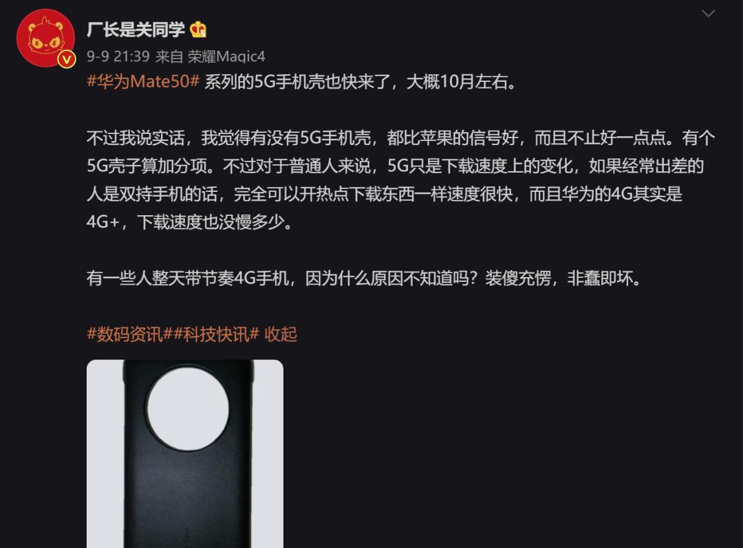 数码博主 @厂长是关同学 透露,华为 Mate 50 系列的 5G 通信壳即将在 10 月和大家见面。