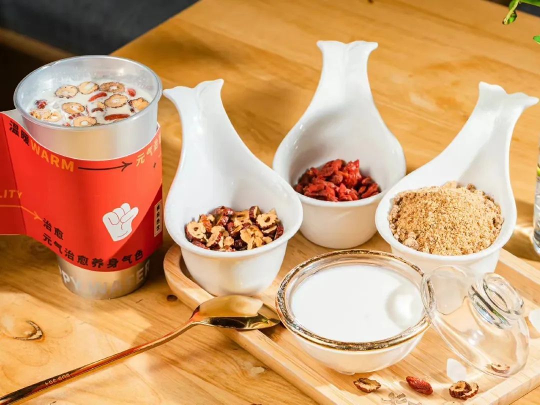 炖物24章推出的阿胶麦芽人气杯、五红气色暖暖杯等“姨妈热饮”