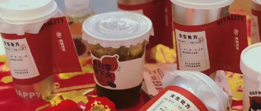 还有把杯套设计成红色“处方样式”,直观标注用到的材料和饮品功效,走在路上十分吸睛。