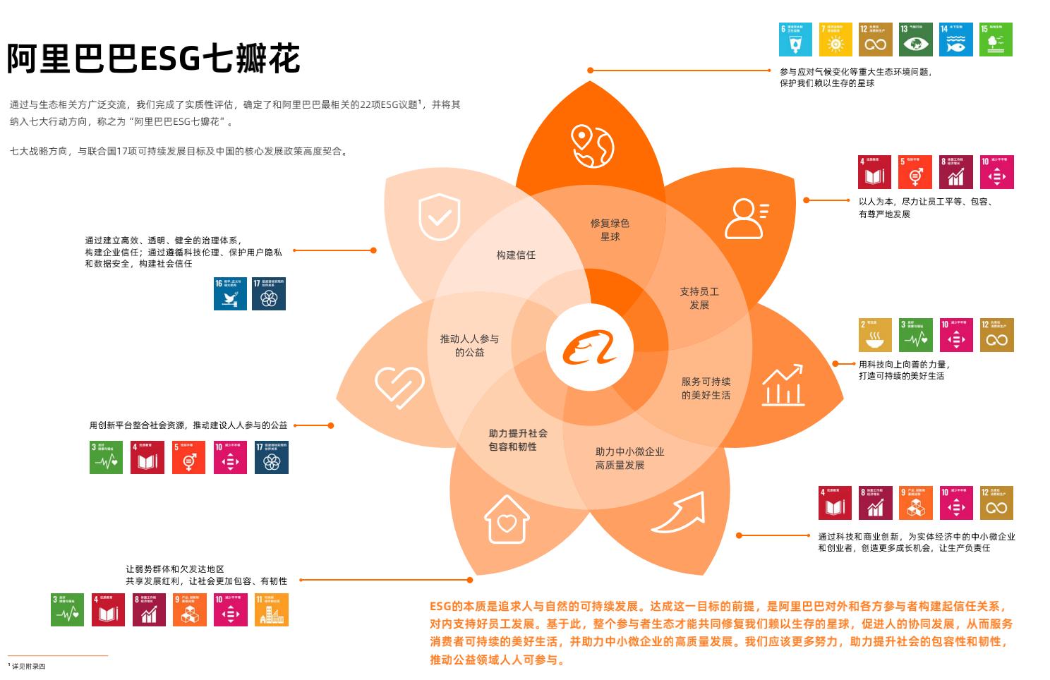在本次报告中,阿里梳理了多年来在ESG方面的投入,形象地总结为“七瓣花”,分别涵盖“修复绿色星球”、“支持员工发展”、“服务可持续的美好生活”、“助力中小微企业高质量发展”等七个方面。