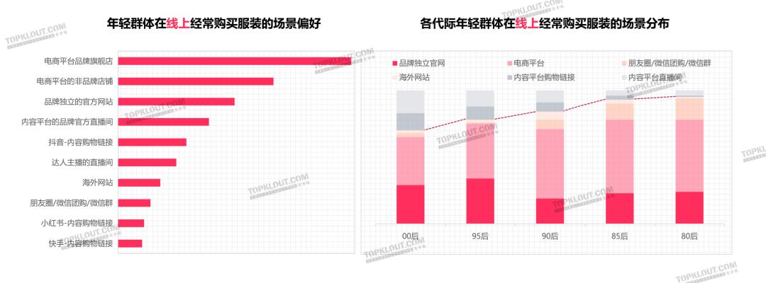 “云逛街”场景接受度逐步向年轻代际渗透,随看随买的消费习惯正在养成。传统电商平台仍然是主流消费场景,内容平台品牌官方店接受度相对较高,00后、95后通过内容中的购物链接购买占比更高。