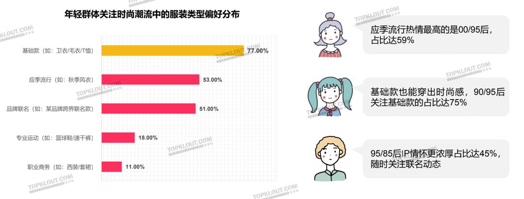 从内容偏好来看,近八成的年轻人关注的时尚潮流是“简约风”,认为基础款能够穿出多个自我。
