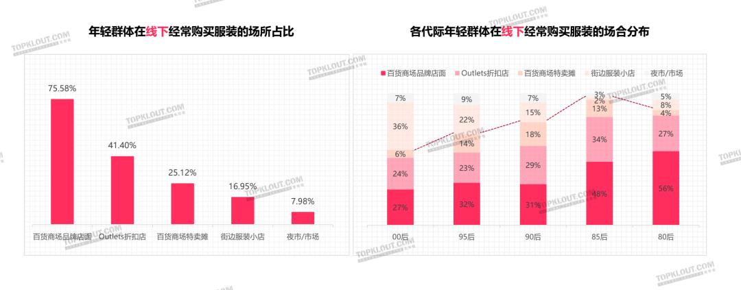 在购买渠道上,超七成的年轻人习惯去品牌专卖店购买服装,随着年龄的递增,不同代际对消费场景的包容性逐渐增强,00后街边服装小店消费比例近4成。