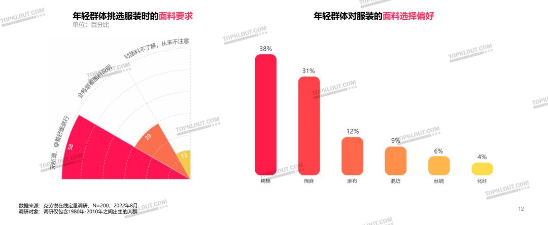 近6成的年轻人对服装的面料无明确要求,更重视穿着的实际感受,其中90后、95后占比超7成,超4成00后表示对面料不了解。近7成的年轻人更倾向选择棉质布料,80后、85后选择纯棉质地的占比高达88%。
