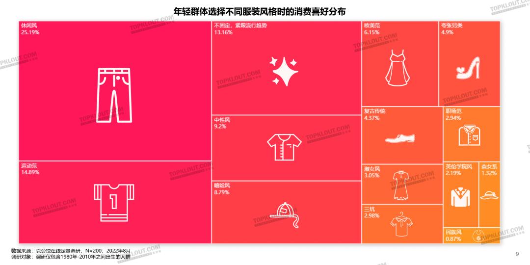 年轻群体选择不同服装风格时的消费喜好存在一定差异,但TA们普遍认为休闲运动百搭不出错,中性风、嘻哈风“又a又飒”。