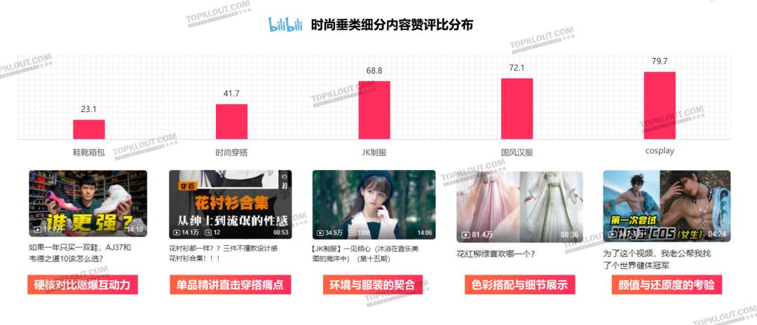 B站的测评和精讲基因浓厚,硬核对比类内容斩获最低赞评比,连衣裙、长裙、运动鞋相关内容受欢迎程度更高。