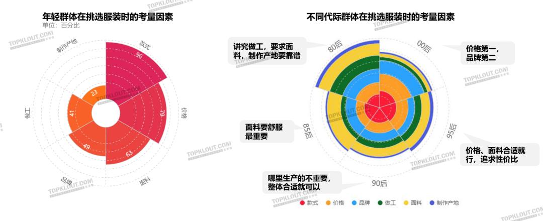 在挑选要素方面,年轻人往往会贯彻“颜值主义”,在重要性上,认为款式>价格>面料>品牌。