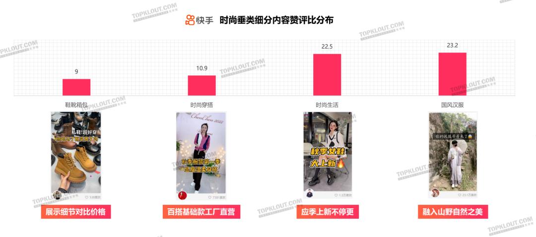 快手的时尚类内容以电商导向为主,电商导购内容占比相对较高。连衣裙、牛仔裤、运动鞋是其受欢迎TOP话题内容。