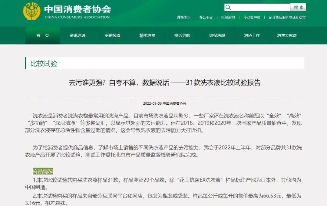 来自中消协官网的信息显示,为了解市场上销售的不同洗衣液产品的去污能力,今年上半年,消协工作人员从部分互联网平台和网店购买 31 款洗衣液样品(涉及 29 个品牌,除“花王抗菌 EX 洗衣液”样品标注产地为日本外,其他均为中国制造),委托北京市产品质量监督检验研究院完成产品的比较试验测试。