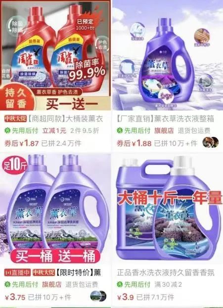 去污力差的洗衣液往往价格也低,中消协点名的3款产品即是例子。同时,青眼在各大电商、直播平台上注意到,当下洗衣液市场品牌繁多,且充斥着大量低价产品。在不少电商平台上,不少洗衣液产品低至1-2元/斤。其中,在拼多多平台,一款由厂家直发的薰衣草洗衣液销量已超10万件。