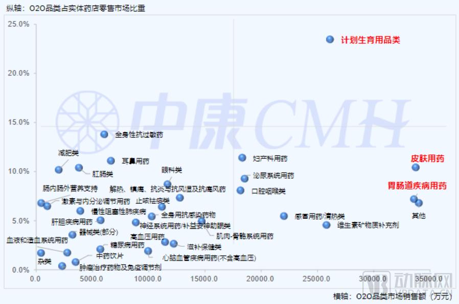 据中康CMH发布的医药O2O数据显示,2022年第二季度,皮肤用药、胃肠道、计生用品为市场份额最高的三类;此外,包括全身性抗过敏药、耳鼻用药、肛肠类用药等在内的7个品类,在实体药店零售市场占比超过10%。从O2O在实体药店零售市场的贡献来看,急、私仍然是用户用药的主要特征。