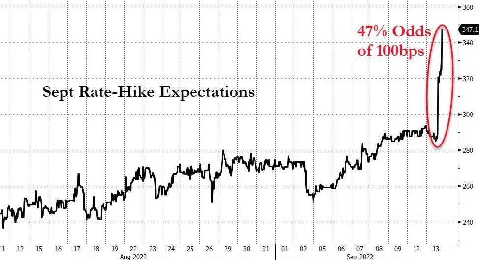 8月CPI和核心CPI双双高于预期,美联储暴力加息预期升温,目前美联储掉期交易已经完全定价美联储9月加息75个基点,市场对美联储下周加息100个基点的预期可能性一度升至47%。