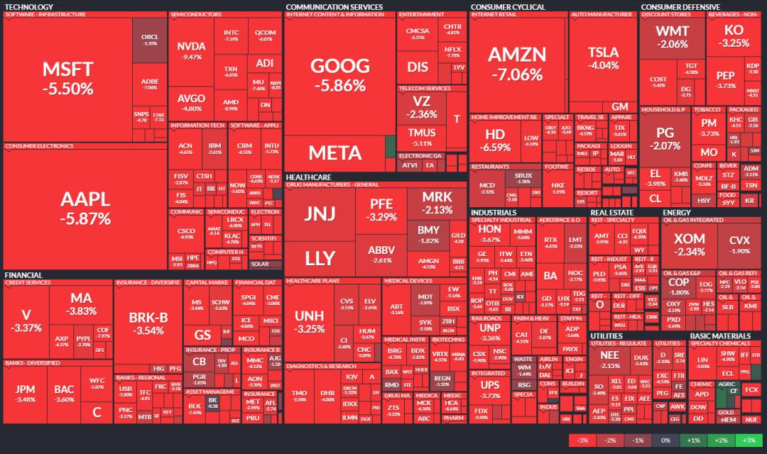 在美联储“暴力加息不止”的预期下,道指和标普跌约4%为2020年6月来最大跌幅,纳指跌幅2020年3月来最大。