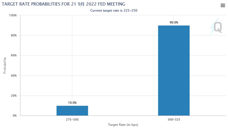 数据公布后,芝商所FedWatch工具显示,美联储9月加息75个基点的概率升至90%,加息50基点的概率降至10%。