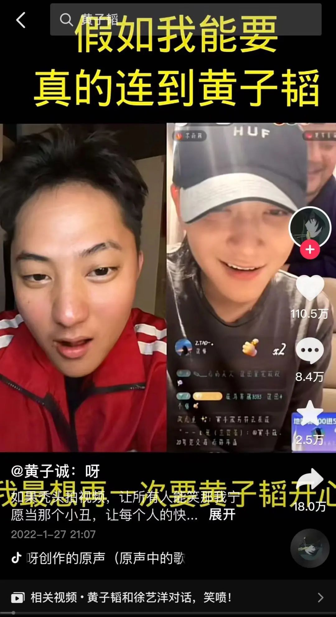 后来网友发现,这条视频内容是“黄子诚”本人为了热度剪辑杜撰出来的。在一次黄子韬本人的直播中,“黄子诚”一直在刷礼物,并动员自己的粉丝刷屏,出于礼貌,黄子韬回应并对他说了几句话。事后,“黄子诚”将视频剪辑,大肆宣传黄子韬与自己连麦,赚足了热度。