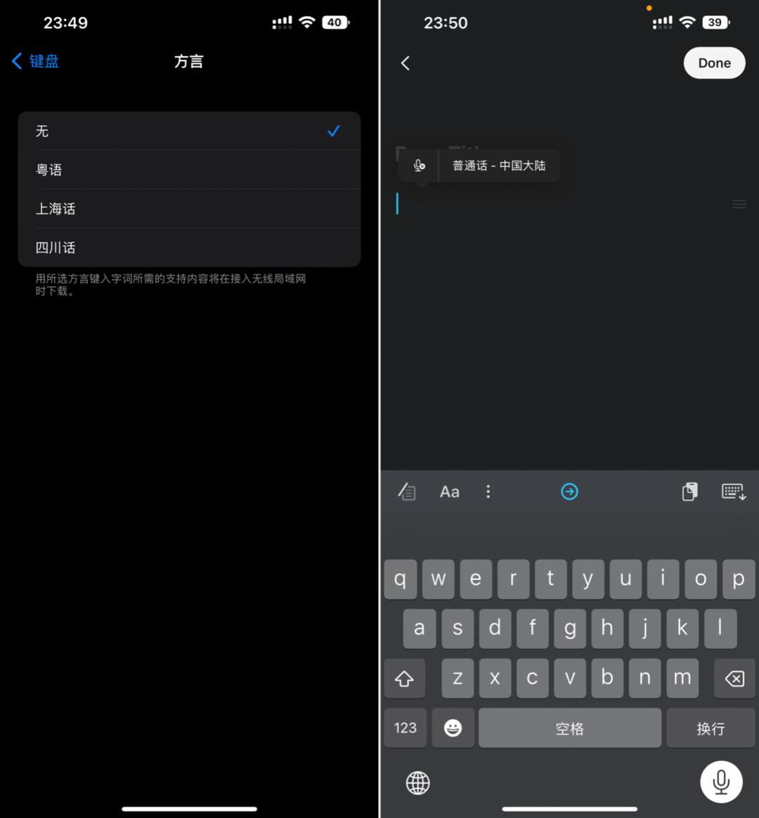 键盘方面,针对拼音输入追加了四川话的选项,可以通过「设置」>「通用」>「键盘」>「方言」进行查看。此外,手动输入和语音输入可以同时执行了。这样一来,即使说错了内容,也可以快速用键盘进行手动修改,无需来回切换输入模式。