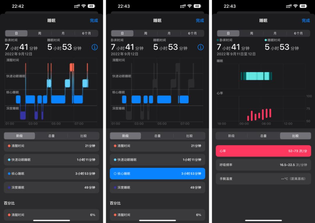 iOS 16 的健康 App 整体设计没有变化,主要追加了两项新的功能,分别是睡眠分析和用药提醒。新版本的睡眠分析不再只是总时长的统计,还加入了睡眠阶段的详细分析,包含清醒时间、快速动眼睡眠、核心睡眠、深度睡眠五个阶段。与此同时,还会记录睡眠期间的心率波动以及呼吸频率的数据信息。