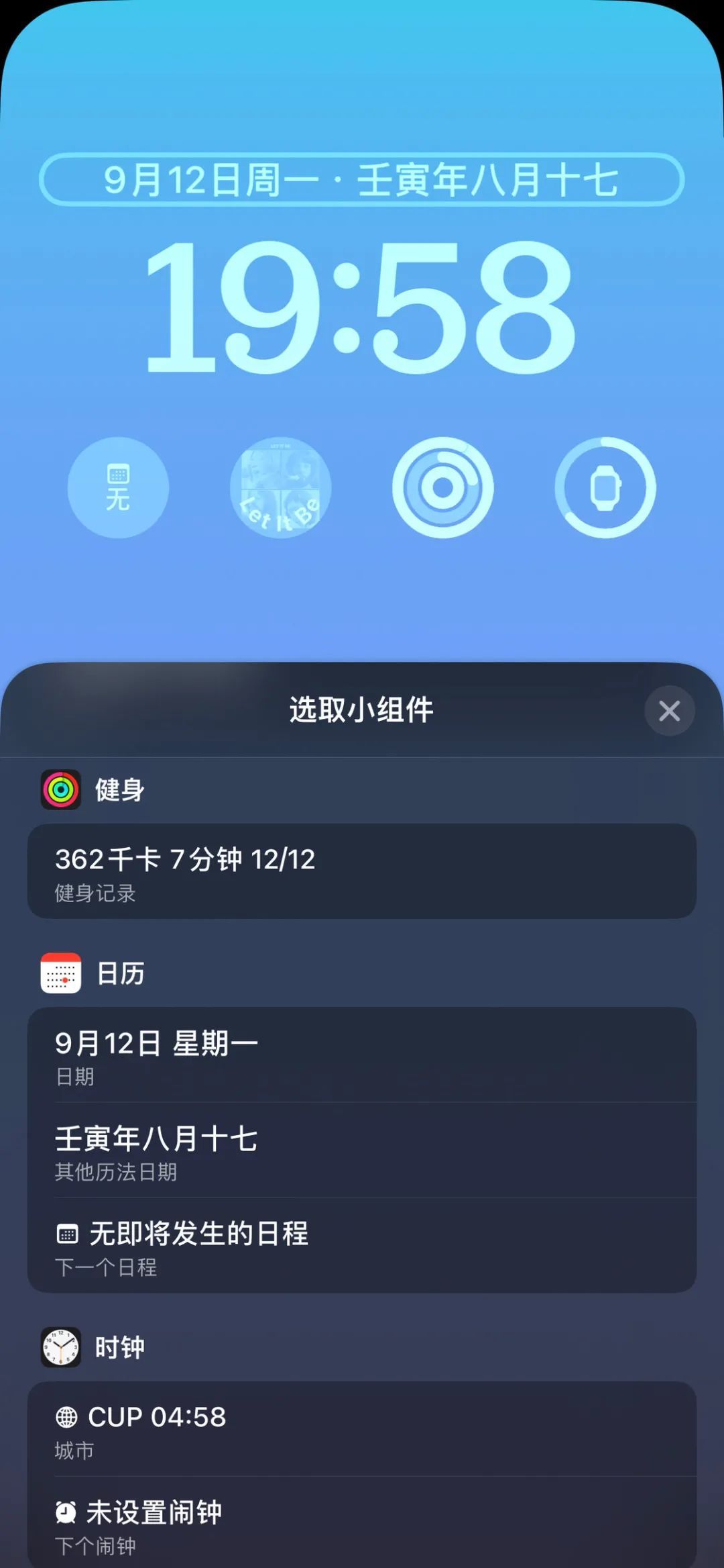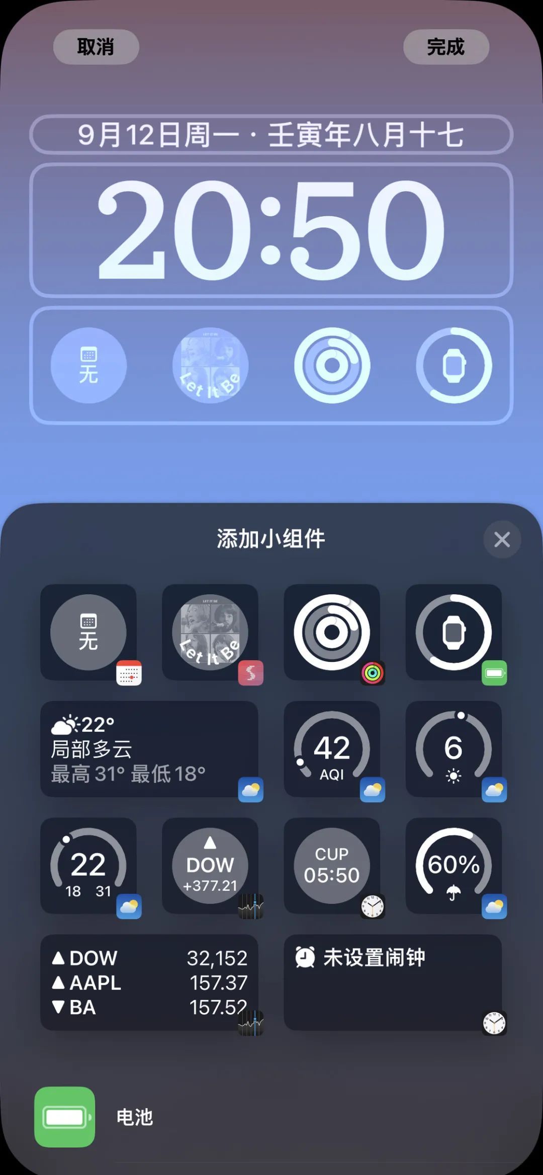 时间的下部区域是模块化的小组件区域,这个区域内的小组件包含了股市、家庭、健身、日历、时钟、提醒事项、天气、电池八个原生类目。和顶部小组件不同的是,这里的组件样式更加丰富,设计感更强,大小选择也更加多样化,你可以根据自己的喜好进行随意搭配。值得一提的是,Apple 已将锁屏的小组件的相关权限开放给开发者,目前已经陆续有多款 App 发布了适配锁屏小组件的版本,如果你发现你在用的 App 支持了锁屏小组件,不妨在评论区与我们分享。