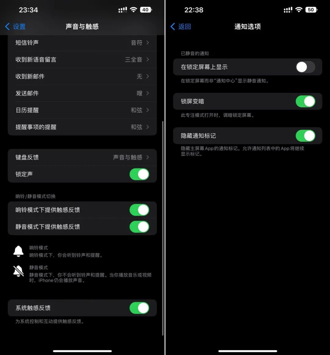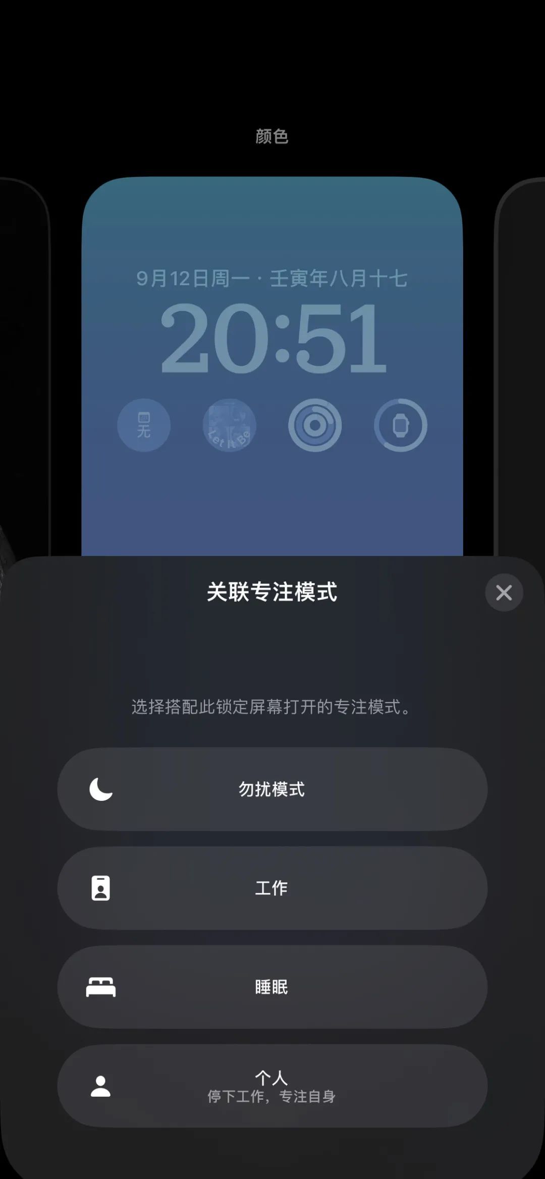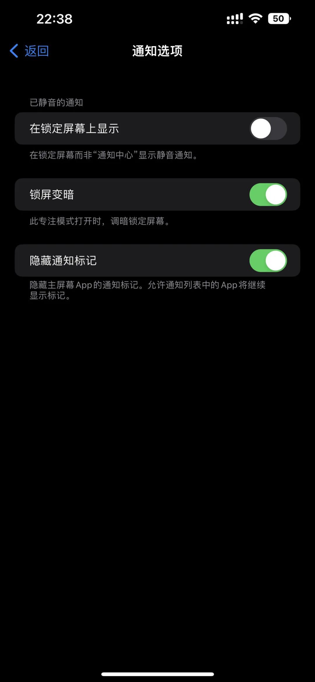 通知方面, 所有专注模式均支持锁屏变暗的设定。其次,还可以在锁定界面显示目前静音的通知,针对于主屏幕的 App 还可以隐藏通知标记,大幅提升你在使用设备时候的专注度。