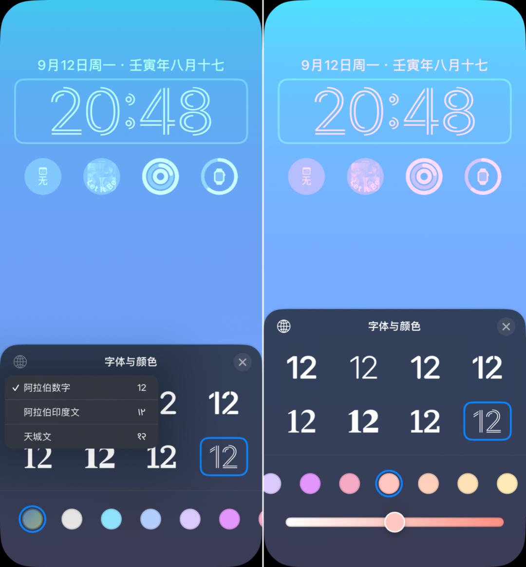 中间的时间部分,Apple 不仅调整了文本的占位大小,还提供了阿拉伯数字、阿拉伯印度文、天城文三种文字,每种文字包含了多种不同的设计样式。除了支持修改文字样式,锁屏文字也提供了丰富的色彩选项,你可以根据喜好或壁纸选择合适的文本色彩搭配使用,色彩设置会同样运用在时间文本上下两侧的小组件中。
