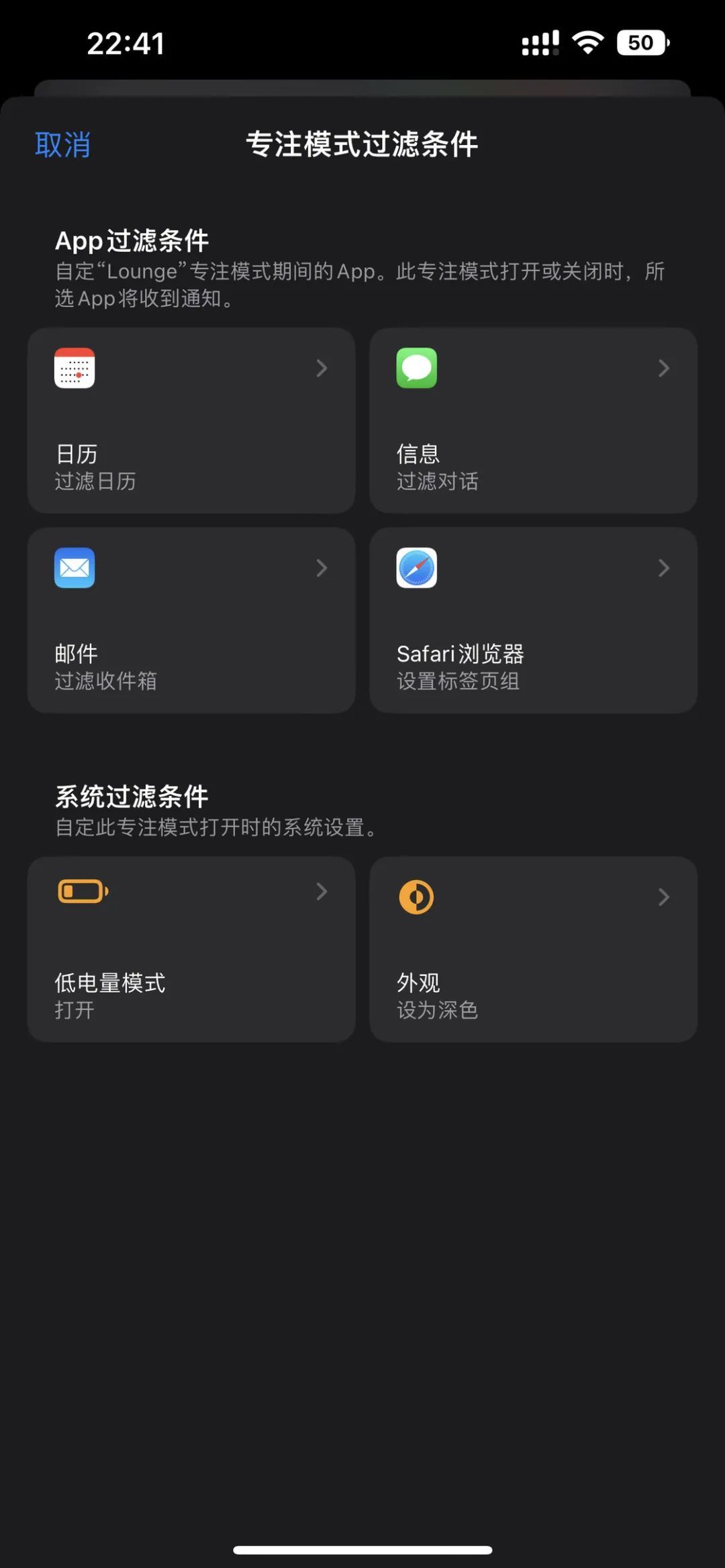 iOS 16 还提供了专注模式过滤条件,在这里你可以针对日历、信息、浏览器、低电量模式、深色模式进行更加细致的设定。例如,当相应的专注模式开启时,日历会会被筛选,其余的日历无法查看,系统会自动开启等等。这样一来,专注模式的功能变得更加自动化、更加个性化。相信在以后的更新中,专注模式应该可以做到更多的事情。