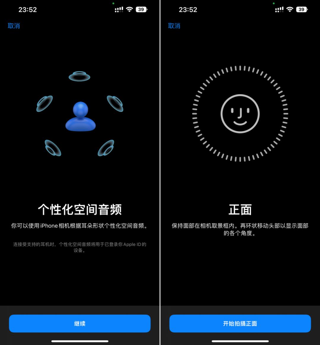 在 iOS 16 中,Apple 再一次优化了空间音频的体验。当你首次设置 AirPods 系列产品时,系统会自动提示将为你定制个性化的空间音频,然后会通过 Face ID 对你的面部以及左右耳进行扫描,在系统中生产属于你专属的几何特征,然后对空间音频进行个性化的适配。你也可以在蓝牙设置中进入 AirPods 耳机的设置页面,调整个性化空间音频的设定。