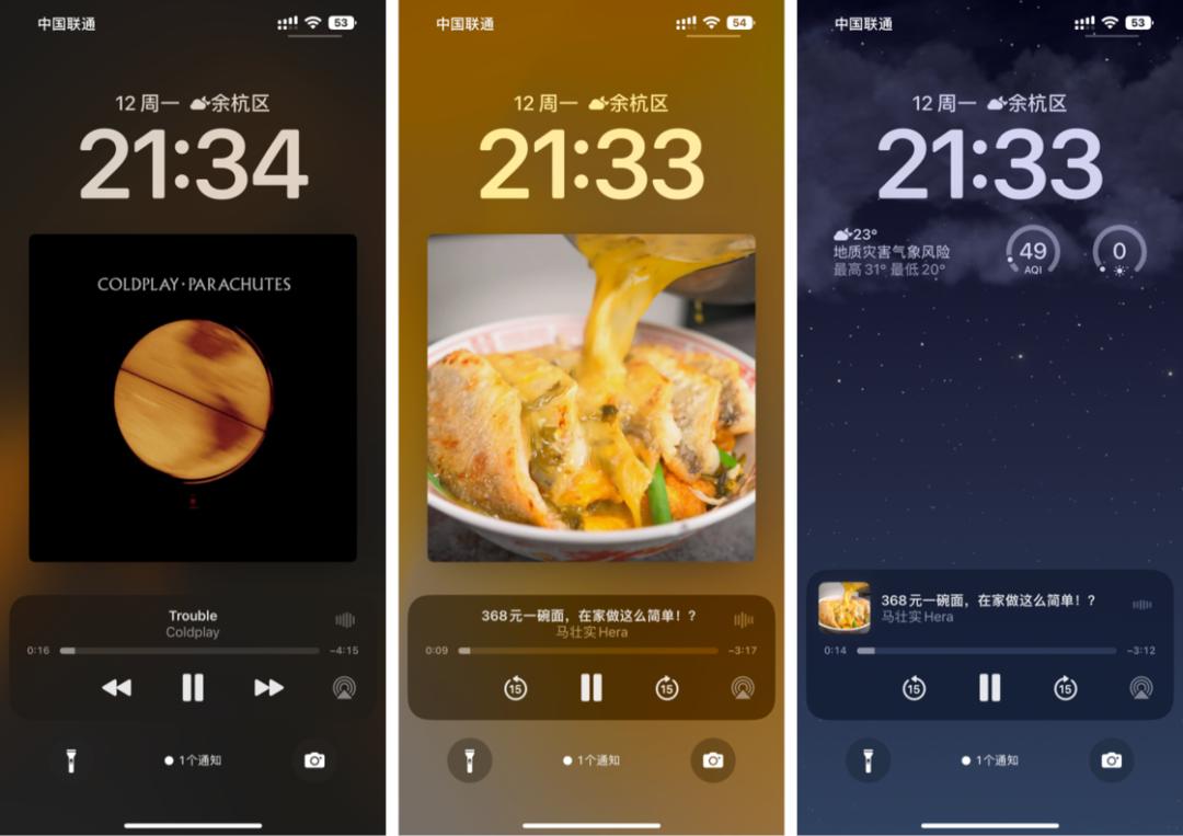 首先,日期文本移到了时间上方;其次,时间文本占位变大,更加醒目;再者,通知中心的信息采用了从下方开始往上堆叠的方式,中部留白区域更多。最后,中上部区域新增了小组件区域。