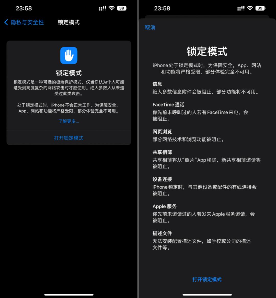 在 iOS 16 中,Apple 推出了名为「锁定模式」的新功能,我们可以在「隐私与安全性」>「锁定模式」中打开它。