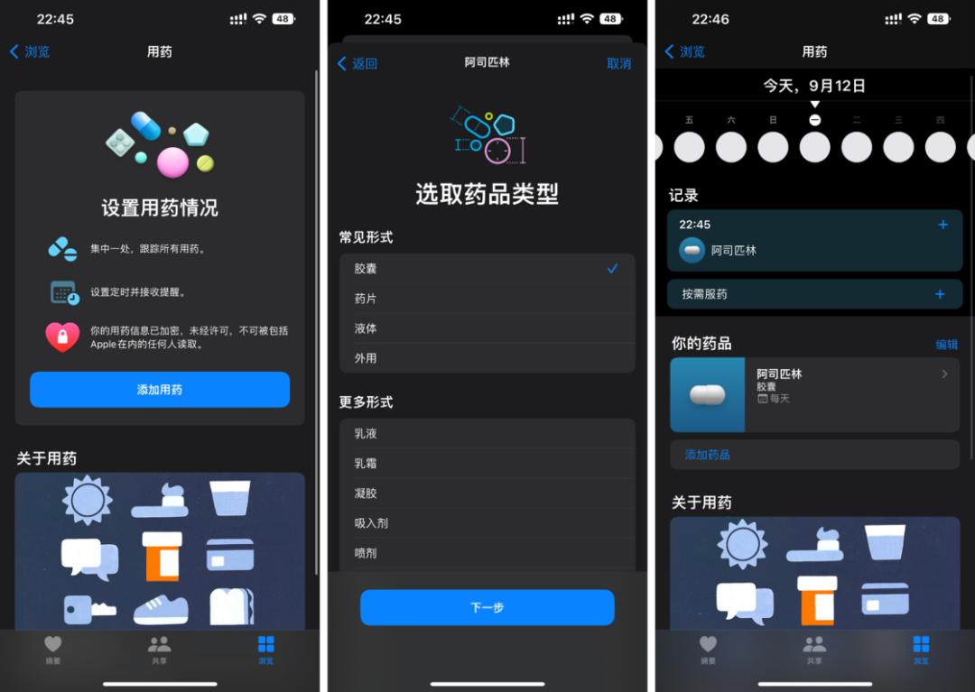 对于有日常药物服用需求的用户,可以在「健康」>「 浏览」>「用药」中设置并管理自己日常药物。设定好药品和服用时间后,iOS 可以按时提示你去服用药物,并记录服药记录。此外,还支持一键导出自己的药品清单,方便购买时使用。