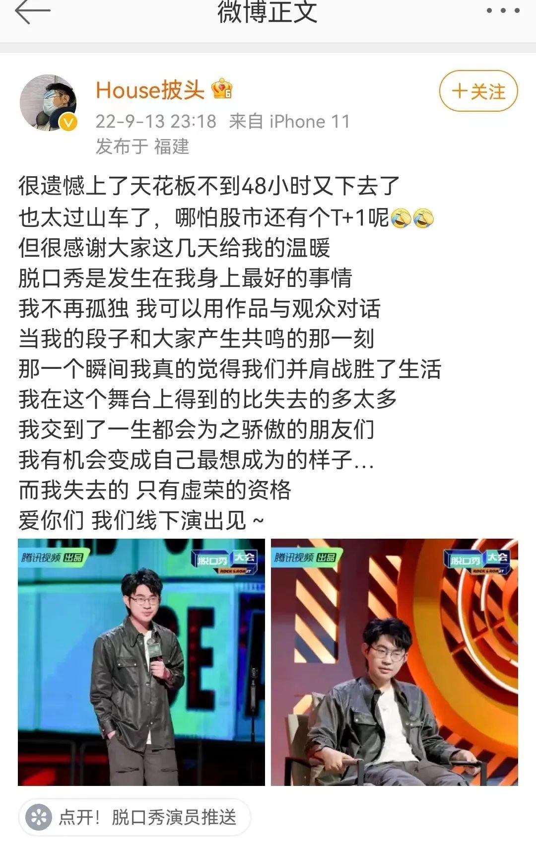 9月13日零点14分,脱口秀演员House在微博回应称,“很感谢朋友们喜欢这段演出,但脱口秀终究是脱口秀,创作这段内容的本心也只是想给大家带来一些快乐。我和家人目前都没有持有这支股票,也没有这个计划。”他的这条微博,很快获得了4.5万点赞。