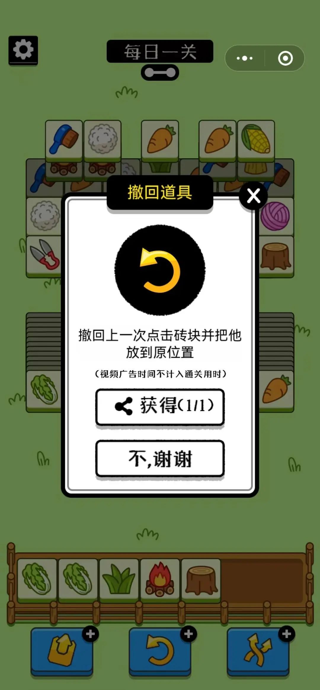 由于第二关的关卡难度过高,绝大多数玩家都需要获取道具来辅助过关,而获取道具只有两种方法,一是将游戏链接分享给好友或群组,还有就是观看视频广告。前者用于实现游戏的迅速传播和裂变,后者可以帮助厂商快速变现。