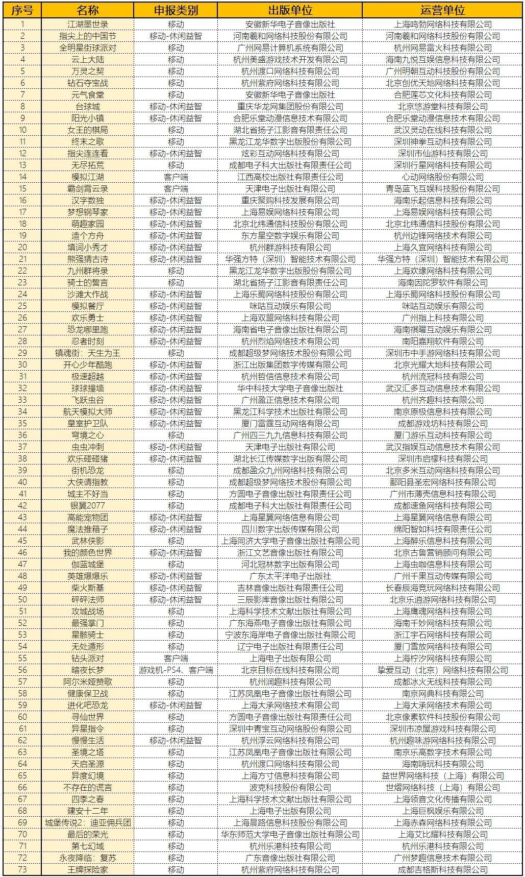 然后便是此次发布的版号信息了,在此次版号中,共有73款国产游戏过审,其中有1款主机端游戏《暗夜长梦》游戏机-PS4、客户端,以及3款客户端游戏《模拟江湖》《霸剑霄云录》《钻头派对》。值得注意的是,从本月开始,休闲益智的游戏类型大幅增加,从审批信息来看,8月的移动-休闲益智游戏为8款,而9月则增加到了31款。其中由南京网典运营的《健康保卫战》属于腾讯旗下公司,也该产品也是在之前曾经登陆过腾讯游戏年度发布会的健康科普休闲塔防游戏,所以也算得这款产品在这里单独列出,因为是非商业化的作品,所以本期腾讯似乎获得了版号,但是似乎又没有获得。