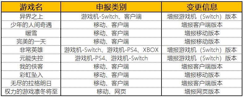 在9月13日晚间公布的除了新一轮的版号外,还有一则2022年游戏审批变更信息,这则信息主要是公布了部分已获取版号的产品的一些信息变化,变更时间为2022年9月13日,这也是非常值得关注的信息。比如,在此次的游戏审批变更信息中,就明确标注了变更信息,包括出版单位和运营单位的变更,增报游戏版本等等,这也非常清楚的指明,一个游戏需要上架不同平台则需要不同平台的版号,所以在此次审批变更信息,共有10款游戏增报了游戏版本,具体信息如下: