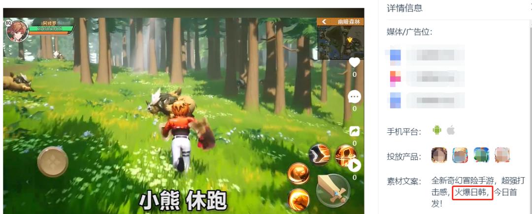 如今某日活破6亿的短视频平台已成为该游戏的买量主阵地,后者的操作手法愈发娴熟,一方面借助效果型达人营销扩大用户覆盖范围,另一方面释出多个马甲包进一步降低获客成本,它们均使用类似素材进行大力推广——广告文案经常提到「开放世界」「火爆日韩」等字眼,来吸引用户下载。官方在这点上却也没有忽悠人,游戏本体确实在韩国等市场表现优异,是2022年上半年韩国地区收入榜名列前茅的中国手游之一。