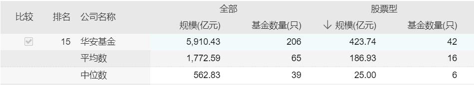 虽然华安基金的股票型基金占比不高,但其管理规模达到423.74亿元,旗下基金42只。Wind数据显示,华安基金的股票型基金规模在149家可比基金管理公司中排在第15位,远超行业25亿元的中位值。