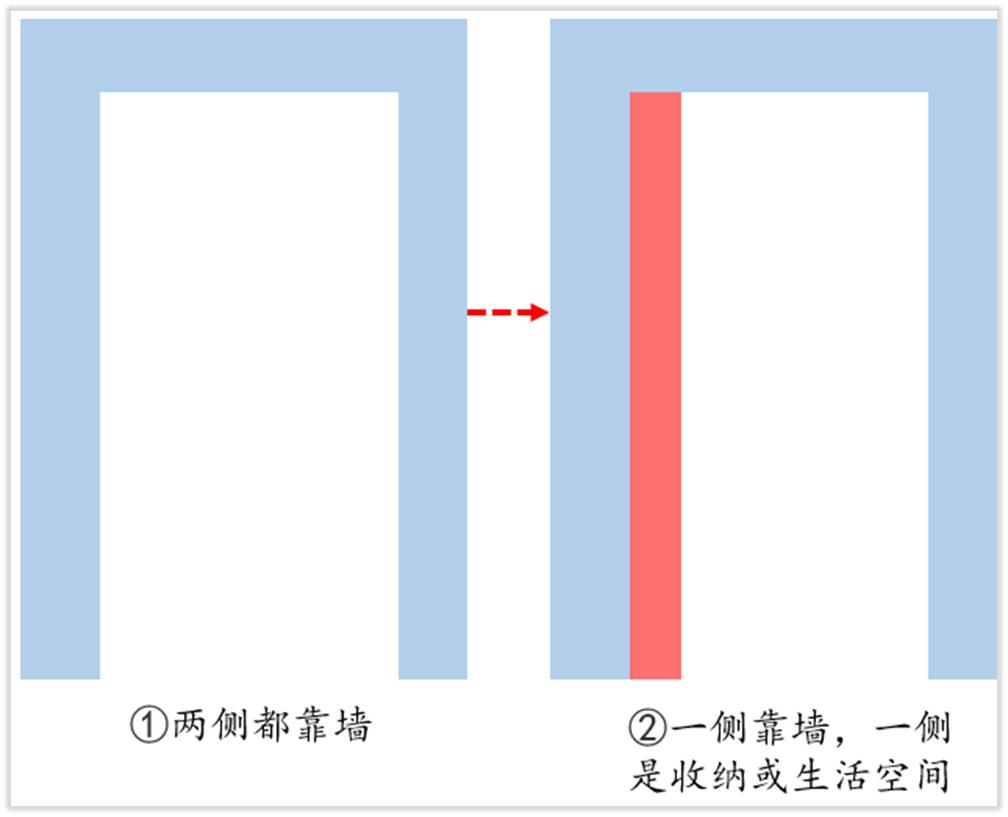 第②中次之,第①中两边都靠墙的走道最不实用,也就是纯走道 。