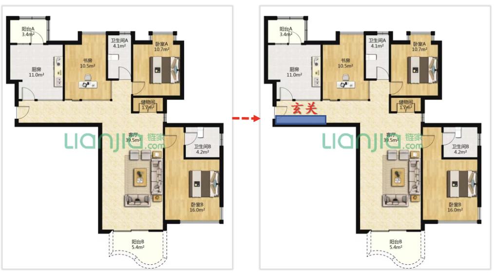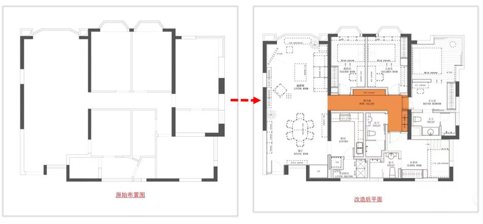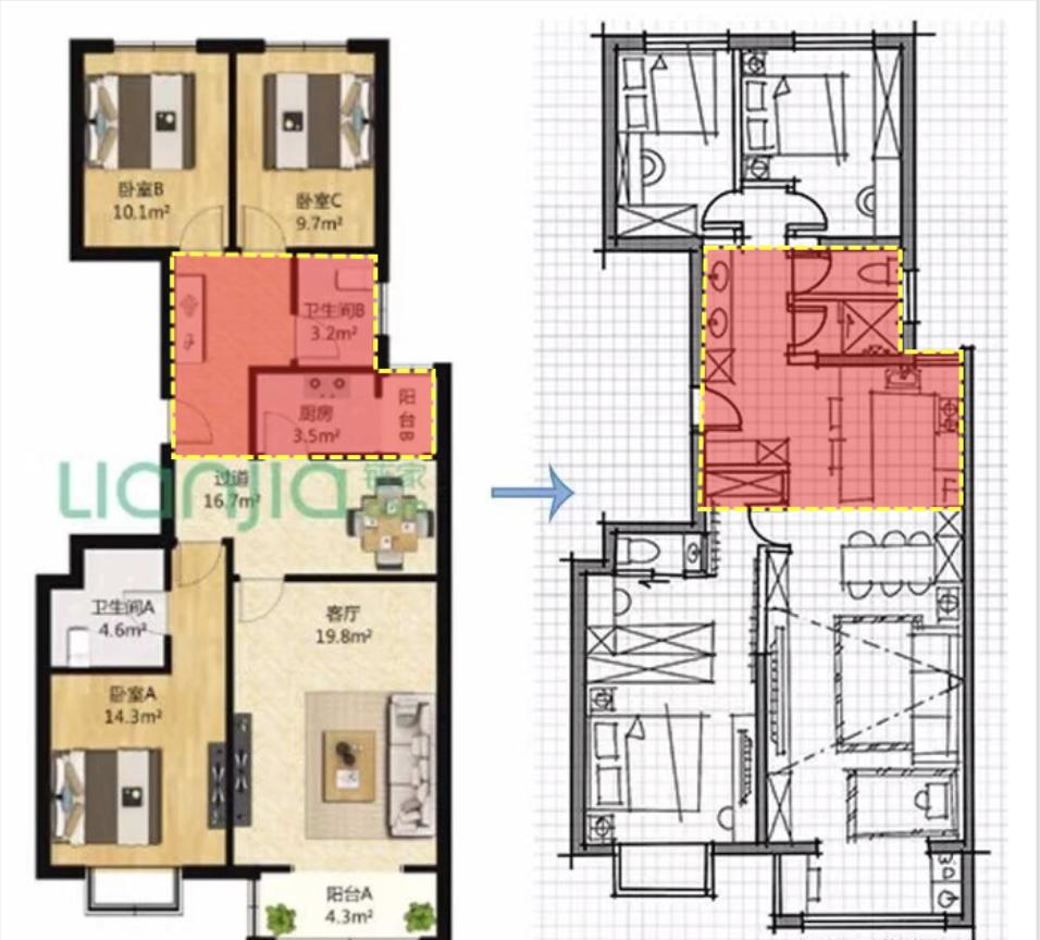 这里可以参考一下开发商做的样板间,它们在户型设计上都会尽量减少走道的浪费。可以借鉴开发商的户型设计来改造 。