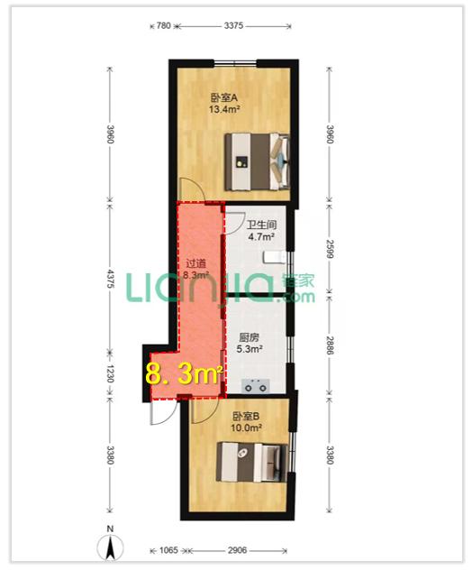 它连接南北之间的卧室,经过卫生间和厨房。这片区域有两处拐角,且过道面积空了很多 。