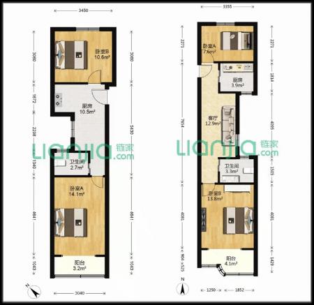 举几个例子,下面这个户型就是典型的长条户型,最大的痛点就是过道浪费太多面积,超过8个平方米 。